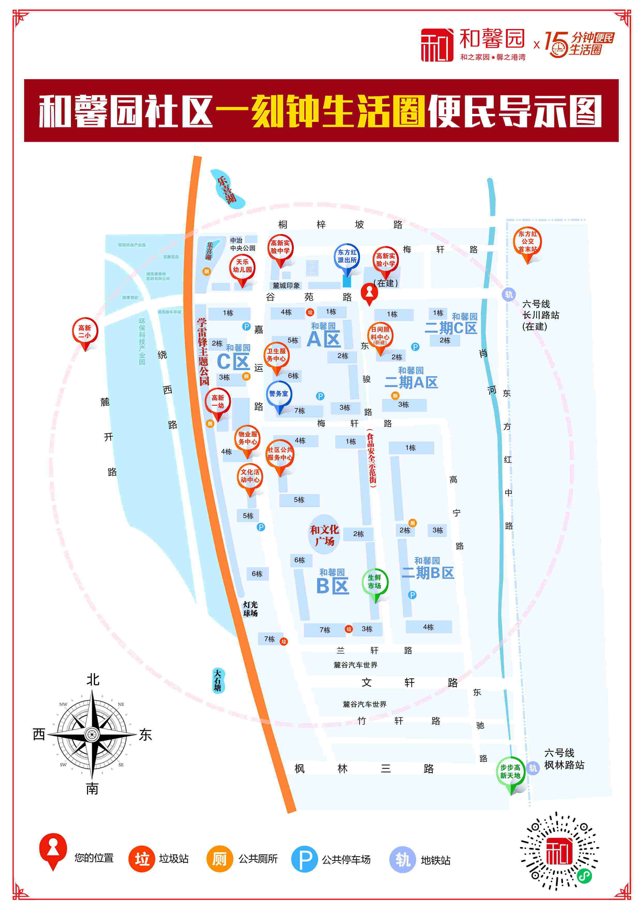 和馨园一刻钟生活圈便民导示图是为居民提供便捷生活服务的导示图,覆盖了居民的日常生活所需,如购物、餐饮、休闲、医疗等。是为了方便居民快速找到所需服务而设计的,它清晰地展示了和馨园生活圈内的各种设施和服务点的位置。