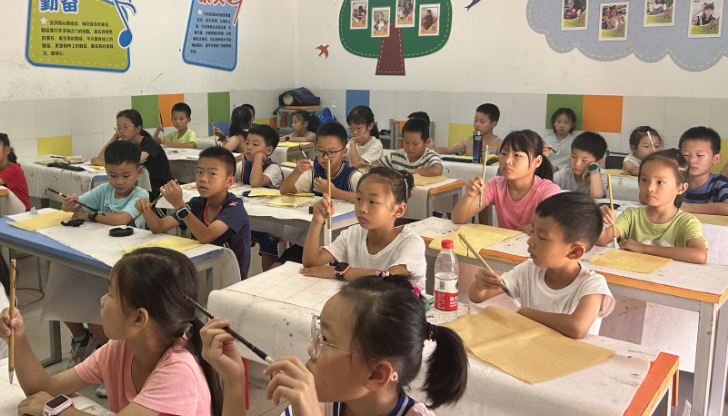 课堂上,授课老师从执笔方法、站姿、坐姿,到书写中的起笔、行笔、收笔,及方圆、粗细、斜正、疏密等进行严格培训,手把手跟进辅导。现场,孩子们学习兴趣浓厚,仔细听、认真学,一笔一划地书写,氛围融洽,书香味十足。