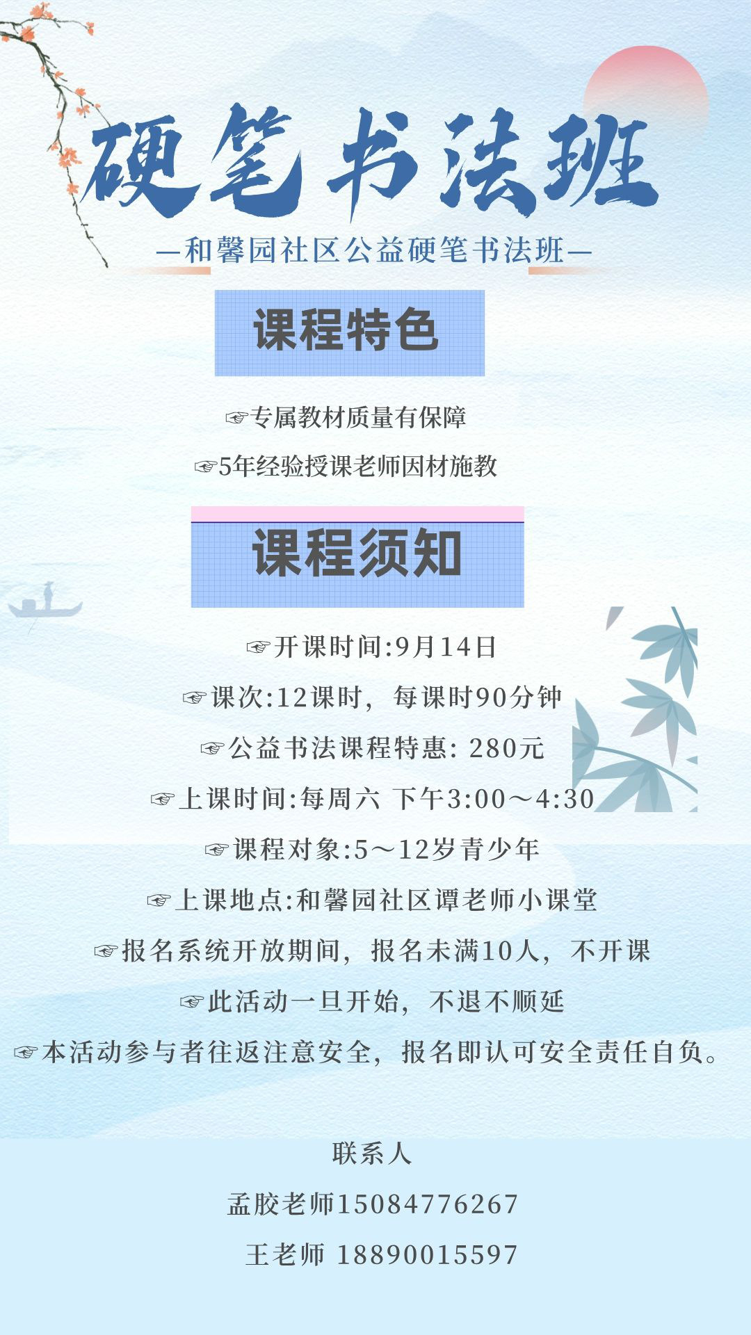 【公益硬笔书法班】9月14日开课一一和馨园社 区公益硬笔书法班