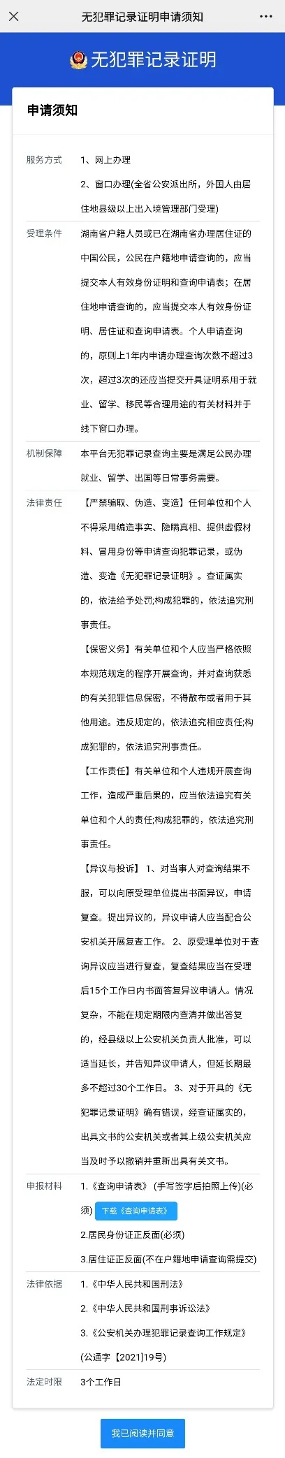 为深化“我为群众办实事”实践活动,进一步优化公安政务服务。即日起,湖南省户籍或持有湖南省居住证的人员因实际工作、生活等需要,可通过湖南公安服务平台申请办理“无犯罪记录证明”。详细操作步骤如下: