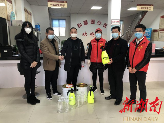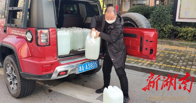 新湖南客户端2020年2月5日讯(通讯员 易瑶)40斤装的84消毒液11桶、20L装的酒精2桶,还细心的准备了大喷壶3个、小喷壶6个。2月5日上午,长沙高新区麓谷街道和馨园社区党员陈治国陆陆续续送来了这些防疫物资。陈治国是2018年感动麓谷十大人物、和馨园社区“兄弟义工队”队长,多年来,他始终怀着对党、对人民无比热爱的赤诚之心,热心于社会公益慈善事业,尽心竭力地为人民群众做好事办实事,通过自身捐款、社会筹款等多种途径融资,为贫困家庭和社会公益事业提供资金援助,为党分忧、为困难群体解难,在百姓心中树立了崇高的形象。受到当地群众和社会各界的广泛赞誉。