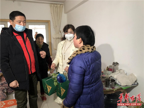 社区肖伟主任和笑帮手总经理文辉给居民送上慰问品